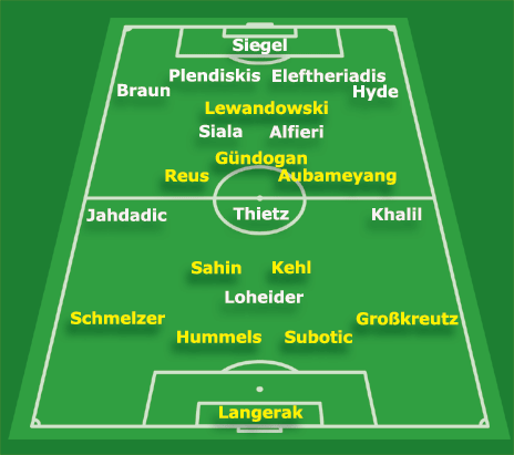 Onze entrant : Langerak - Großkreutz, Subotic, Hummels, Schmelzer - Kehl, Sahin, Aubameyang, Gündogan, Reus - Lewandowski