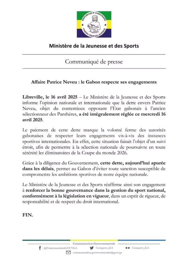 Conscient de l’enjeu, le gouvernement de Brice Clotaire Oligui Nguema a réagi rapidement. Le ministère des Sports a confirmé que Patrice Neveu a bien été payé dans les délais. Une bonne nouvelle pour les Panthères, qui conservent tous leurs acquis dans la course à une qualification historique pour le Mondial.