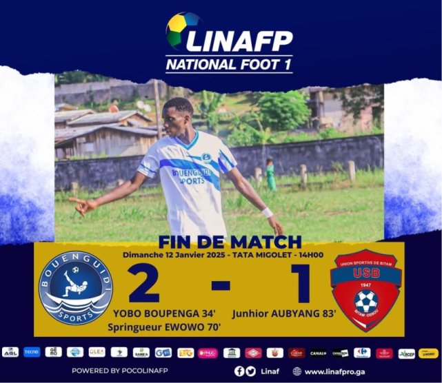 À Koulamoutou, la 9ᵉ journée du National Foot 1 a livré son verdict. Bouenguidi Sports a infligé une défaite à l’Union Sportive de Bitam (USB), s’imposant 2-1 ce dimanche 12 janvier 2025 au stade Tata Migolet.